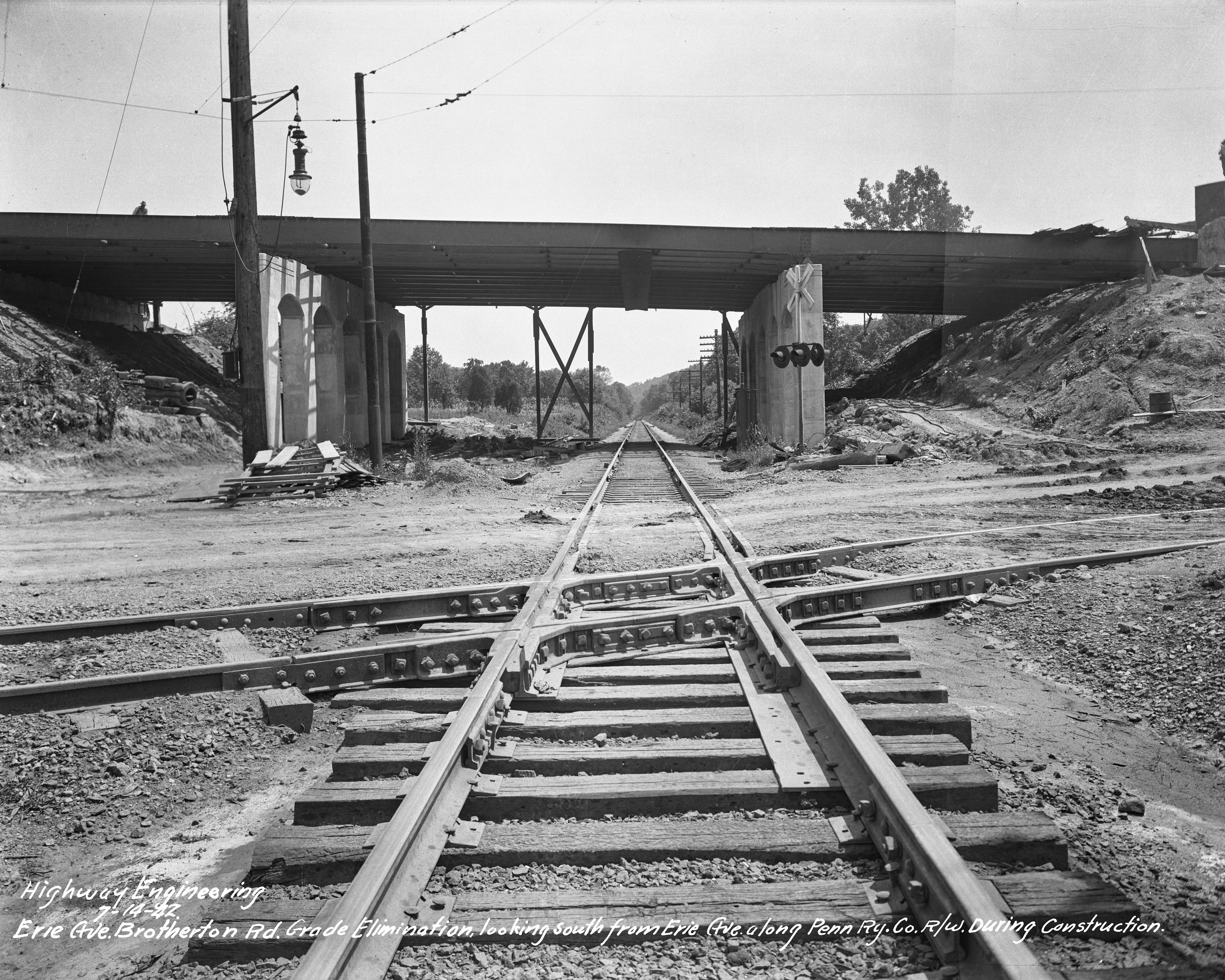 Historic photo of the PRR Richmond Division tracks intersecting with Erie Avenue streetcar tracks at the border between East Hyde Park and Madisonville, looking south. The diamond from the previous photo was closer to the new overpass and was removed before this photo was taken. Only one streetcar track was left to continue service, which was going to be replaced with trolleybuses, but was not permitted due to wartime rubber rationing. From the University of Cincinnati Library Digital Resource Commons, Street Construction and Improvements collection.