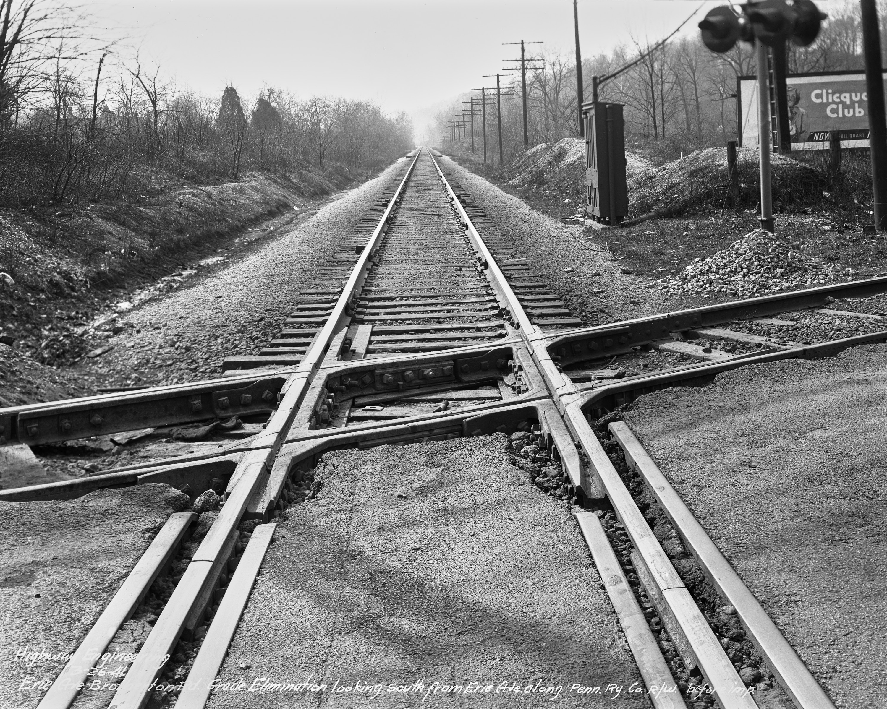 Historic photo of the PRR Richmond Division tracks intersecting with Erie Avenue streetcar tracks at the border between East Hyde Park and Madisonville, looking south. This crossing was eliminated and the new Erie Avenue overpass is about 50 feet south of here. From the University of Cincinnati Library Digital Resource Commons, Street Construction and Improvements collection.