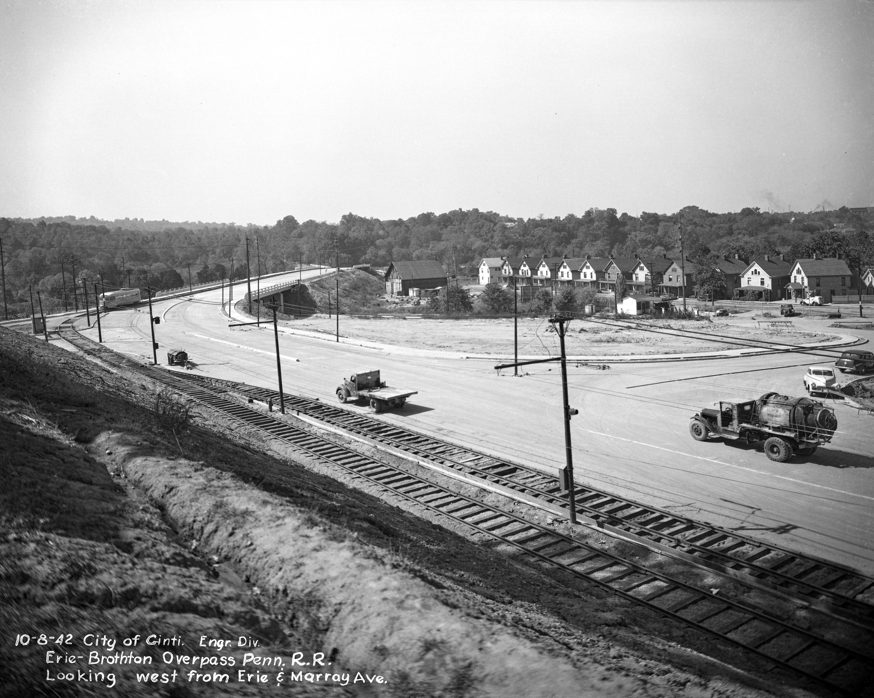 Historic photo of the realigned Erie Avenue and the new bridge over Red Bank Road, with the partially demolished CM&B car barn in the distance, looking west from above the new intersection with Murray Avenue. Due to wartime rationing of rubber, the streetcar line on Erie Avenue couldn't be converted to trolleybus, so this temporary track with passing sidings was installed to keep streetcars running. From the University of Cincinnati Library Digital Resource Commons, Street Construction and Improvements collection.