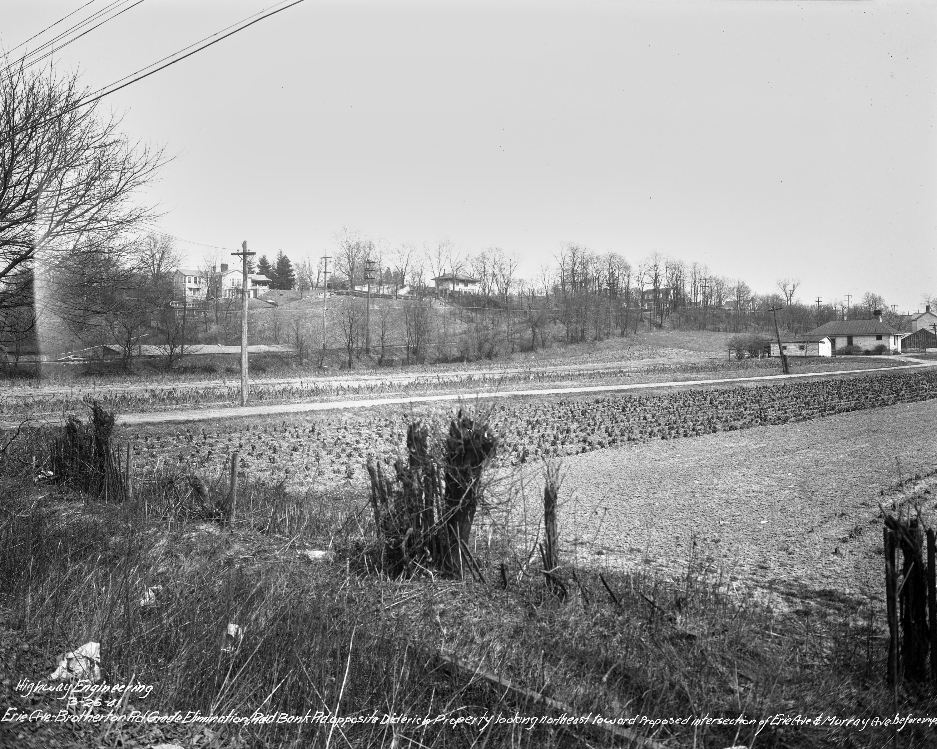 Historic photo of former CM&B tracks east of Red Bank Road in Madisonville and Fairfax, looking northeast. The houses in the distance on the hill are on the LaCrosse Avenue. The CM&B can be seen following the trees. The field in the foreground is now at the rear of the Fairfax Wal-Mart. From the University of Cincinnati Library Digital Resource Commons, Street Construction and Improvements collection.