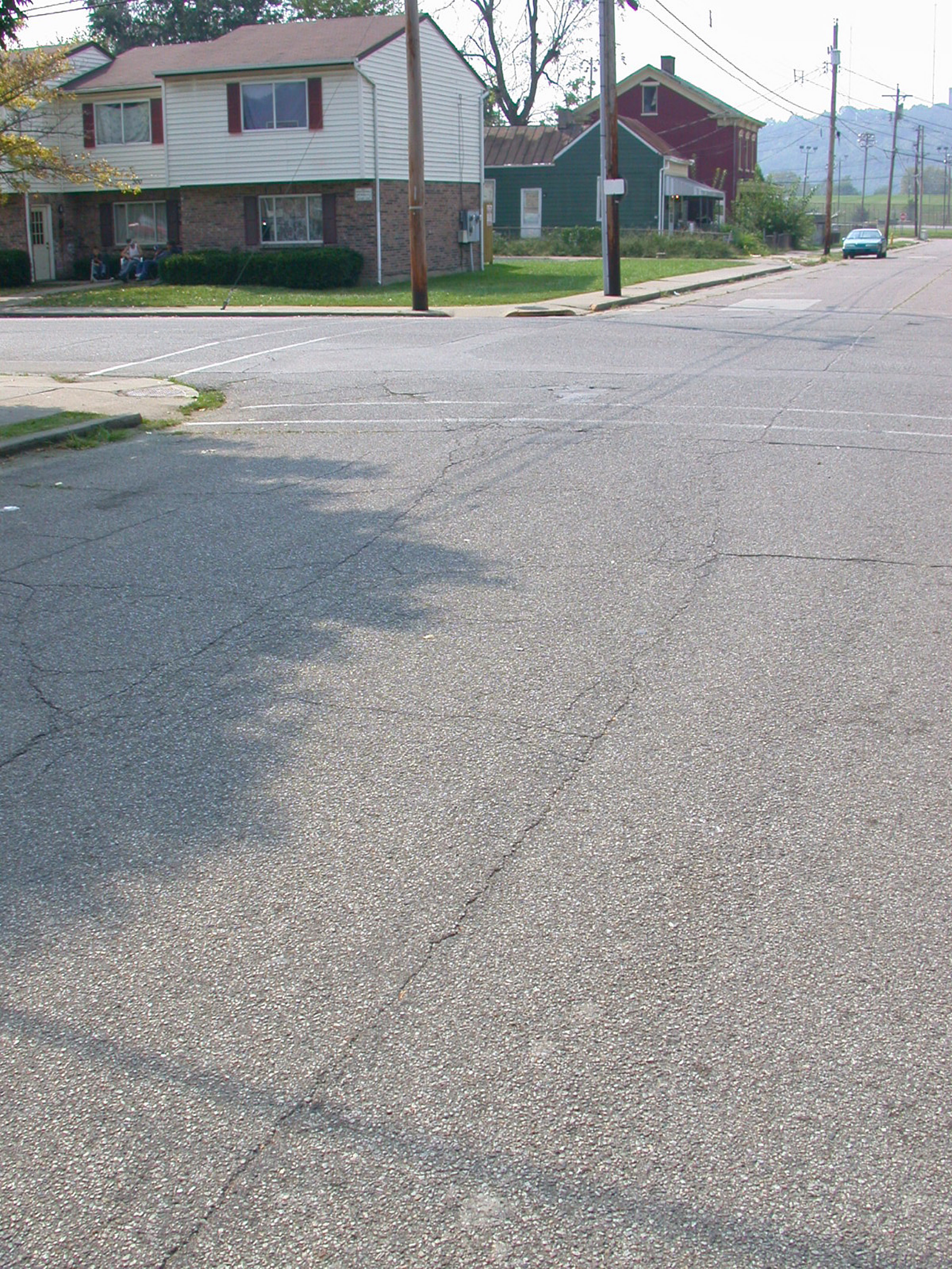 Cracks in the street reveal buried tracks at 3rd Avenue and Clay Street in Dayton Kentucky, looking west. The curve of the track onto Clay Street is very apparent here. This is one of the best examples of pavement cracking due to tracks that I've seen. It's very clearly defined here because the asphalt overlay is thin, and since it's a residential street, there's not much traffic to cause other cracks to appear.
