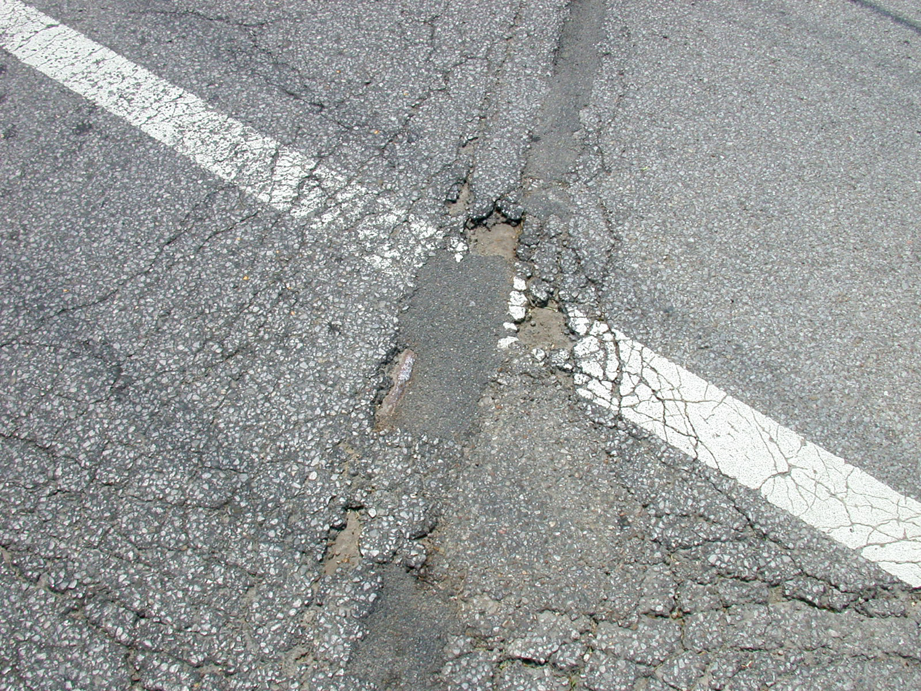 Close up of tracks appearing through deteriorated pavement on Ft. Thomas Avenue in Ft. Thomas, at the intersection with Grand Avenue.