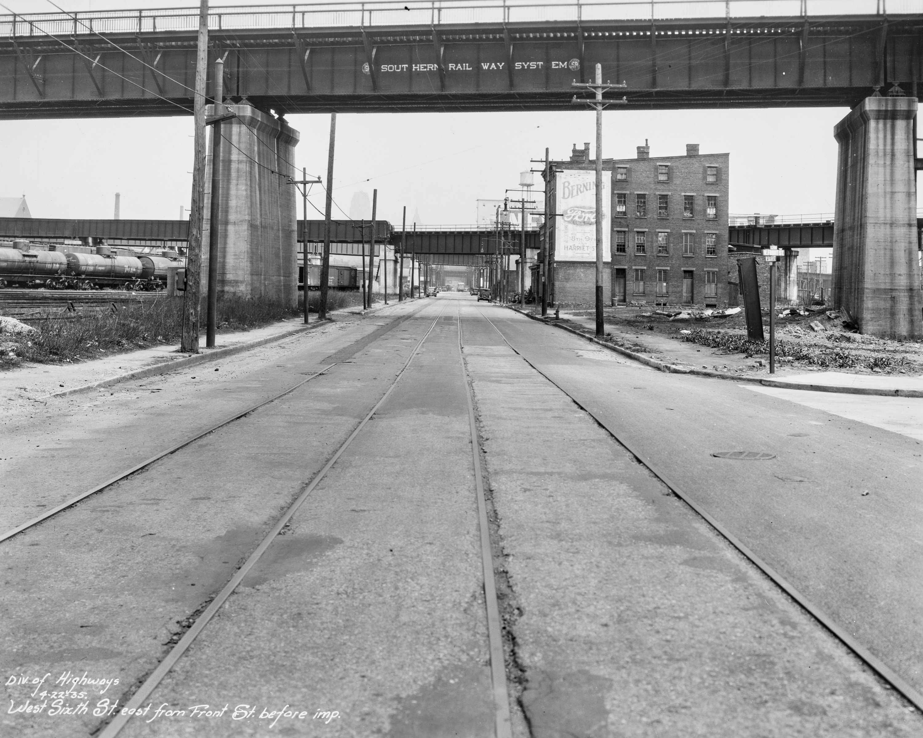 Historic photo of streetcar tracks on West 6th Street at Front Street in Queensgate, looking east towards downtown. The Southern Railway bridge approach is overhead. Note the pedestrian walkway, which has since been closed off and partially removed. From the University of Cincinnati Library Digital Resource Commons, Street Construction and Improvements collection.