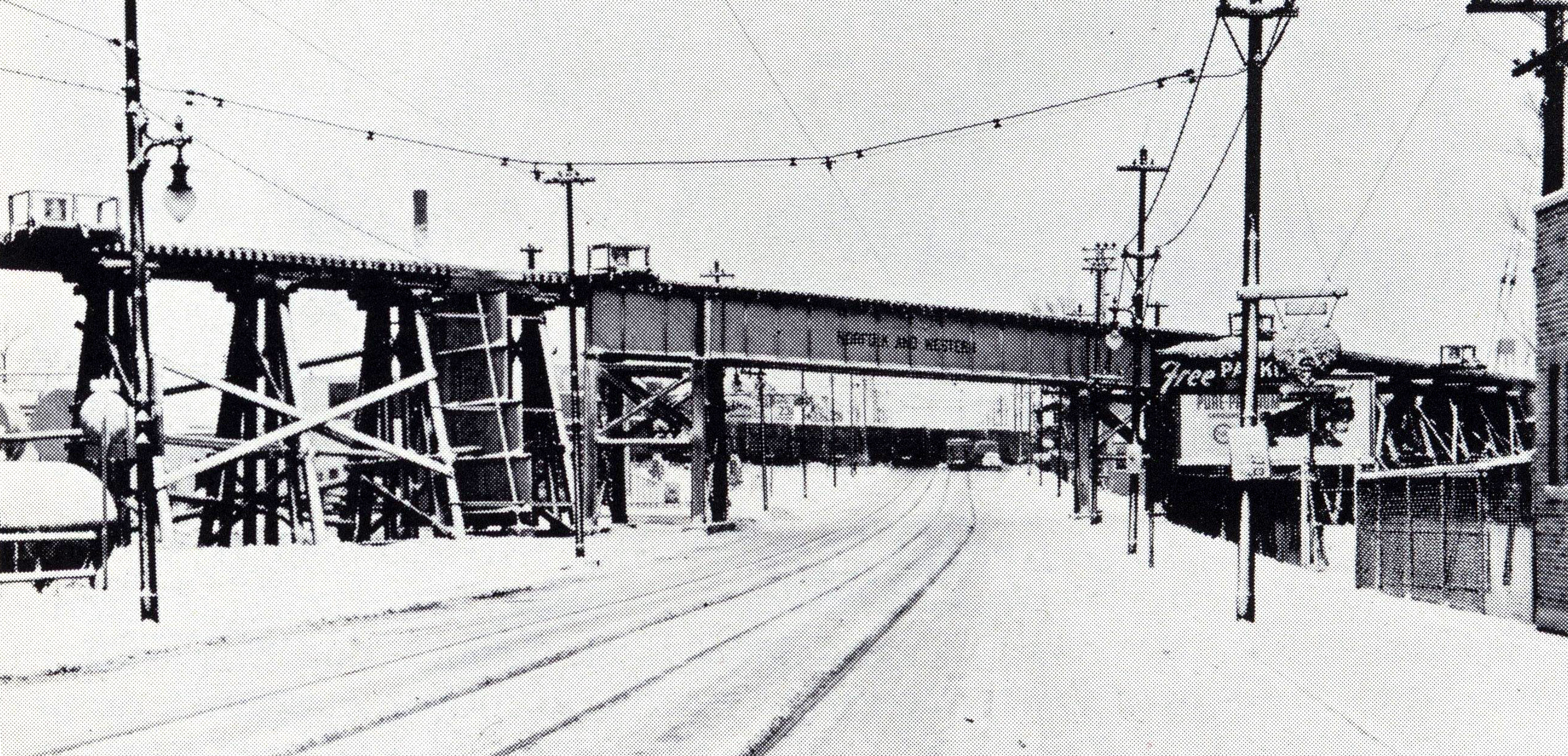 Historic photo of the N&W trestle over Vine Street in St. Bernard, looking south. A southbound streetcar and other vehicles are waiting for a Big Four/NYC train going into the Ivorydale Yard and factory in the distance.