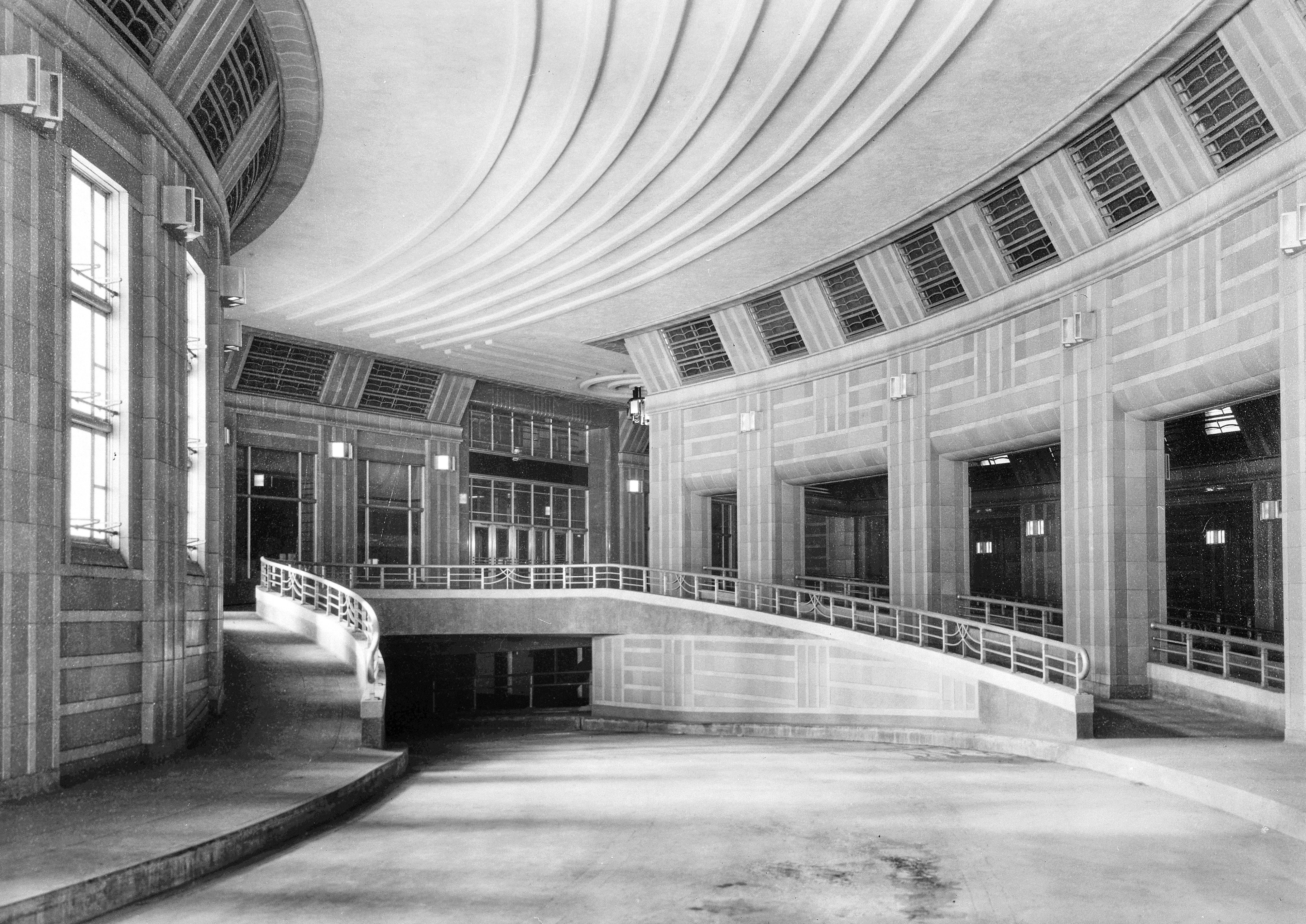 Historic photo inside Union Terminal, showing the taxi ramp on the north side of the building. Ths is now the entrance to the Natural History Museum.