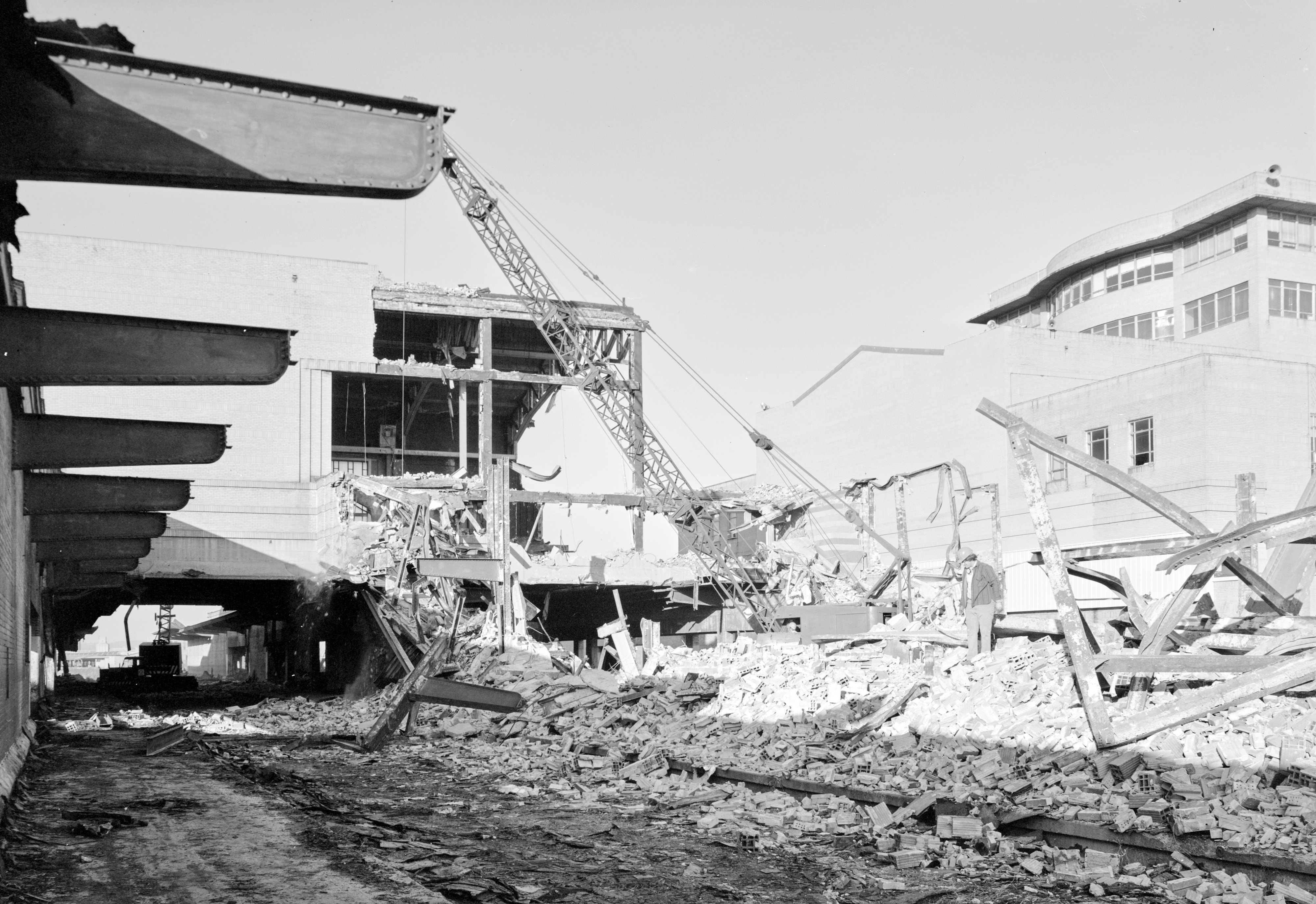 The Union Terminal Concourse under demolition in 1974, looking northeast. The area in the center, behind the wrecking crane, is the portion of the concourse from the last photo. The low clearances can be seen at the bottom left. The steel beams marching up the left side of the photo are from one of the platform canopies. Note that the connection between the concourse and the main headhouse has already been patched up. Tower A can be seen at the top right.