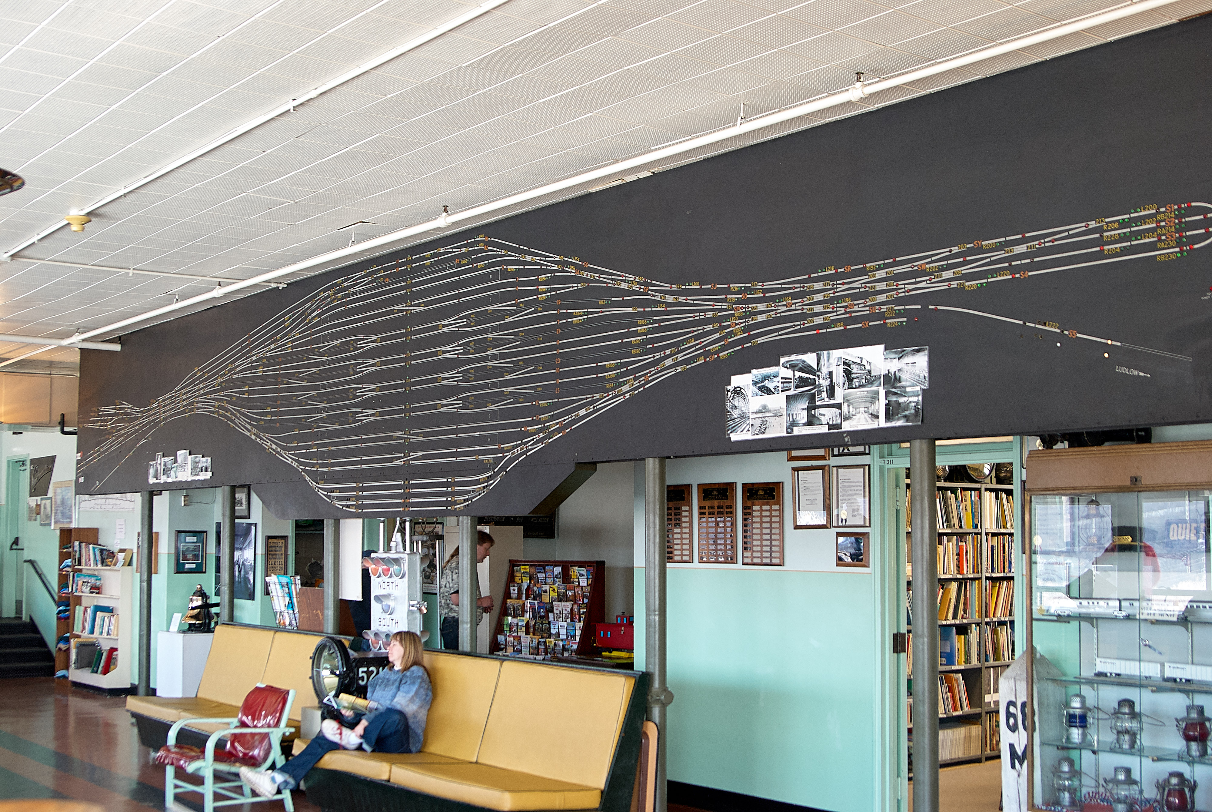 The old track switch board inside Tower A in Union Terminal. This massive control board was recently restored and also moved up out of head-banging height. The rest of the tower is now an observation area with many historic artifacts and books.