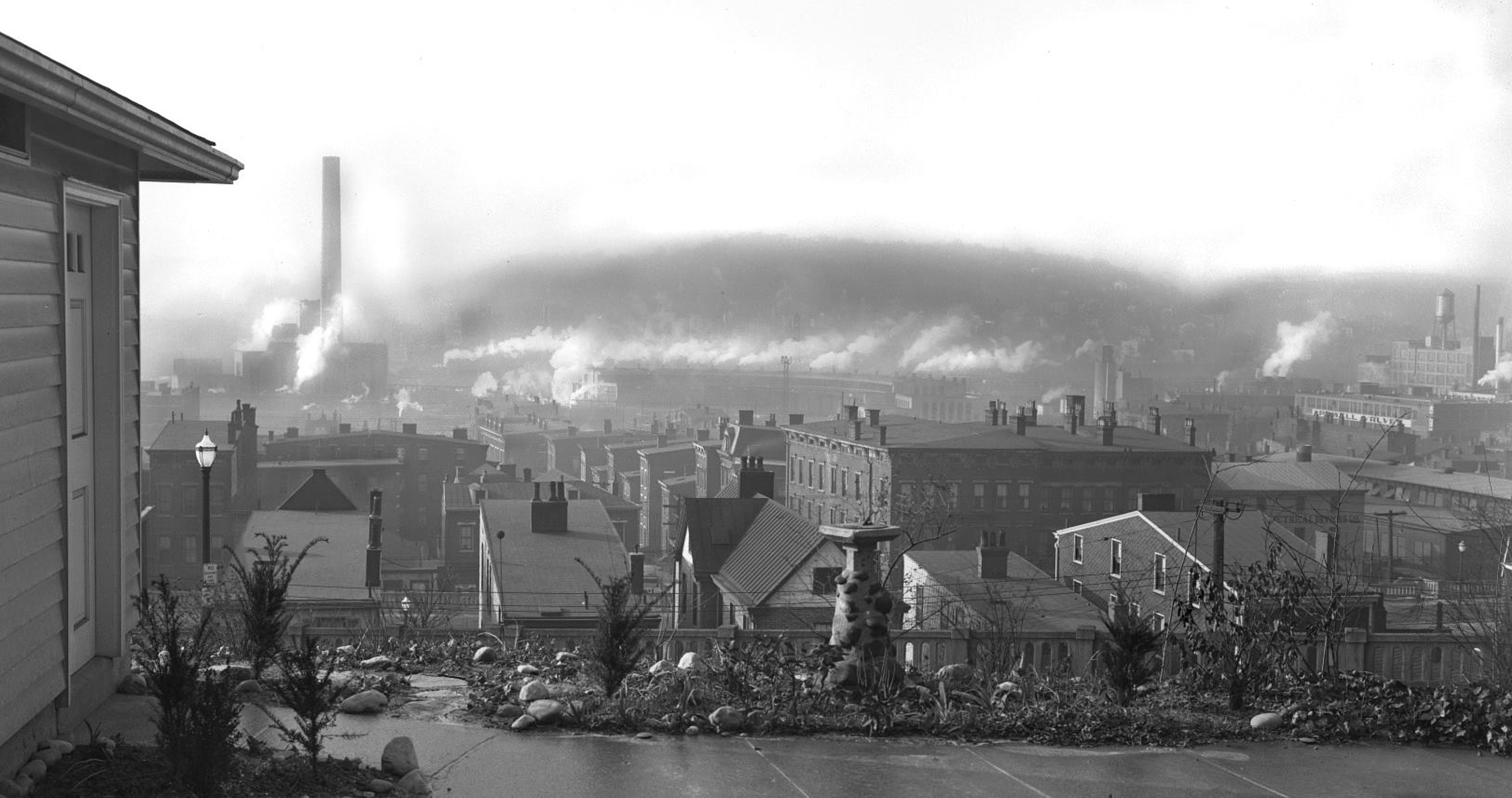 Historic photo of Union Terminal's massive roundhouse and steam plant, which were just north of the Western Hills Viaduct. This photo is looking west from the back yard of one of the houses on McMicken Street. The concrete railing near the bottom is on McMillan Street heading down to Central Parkway.